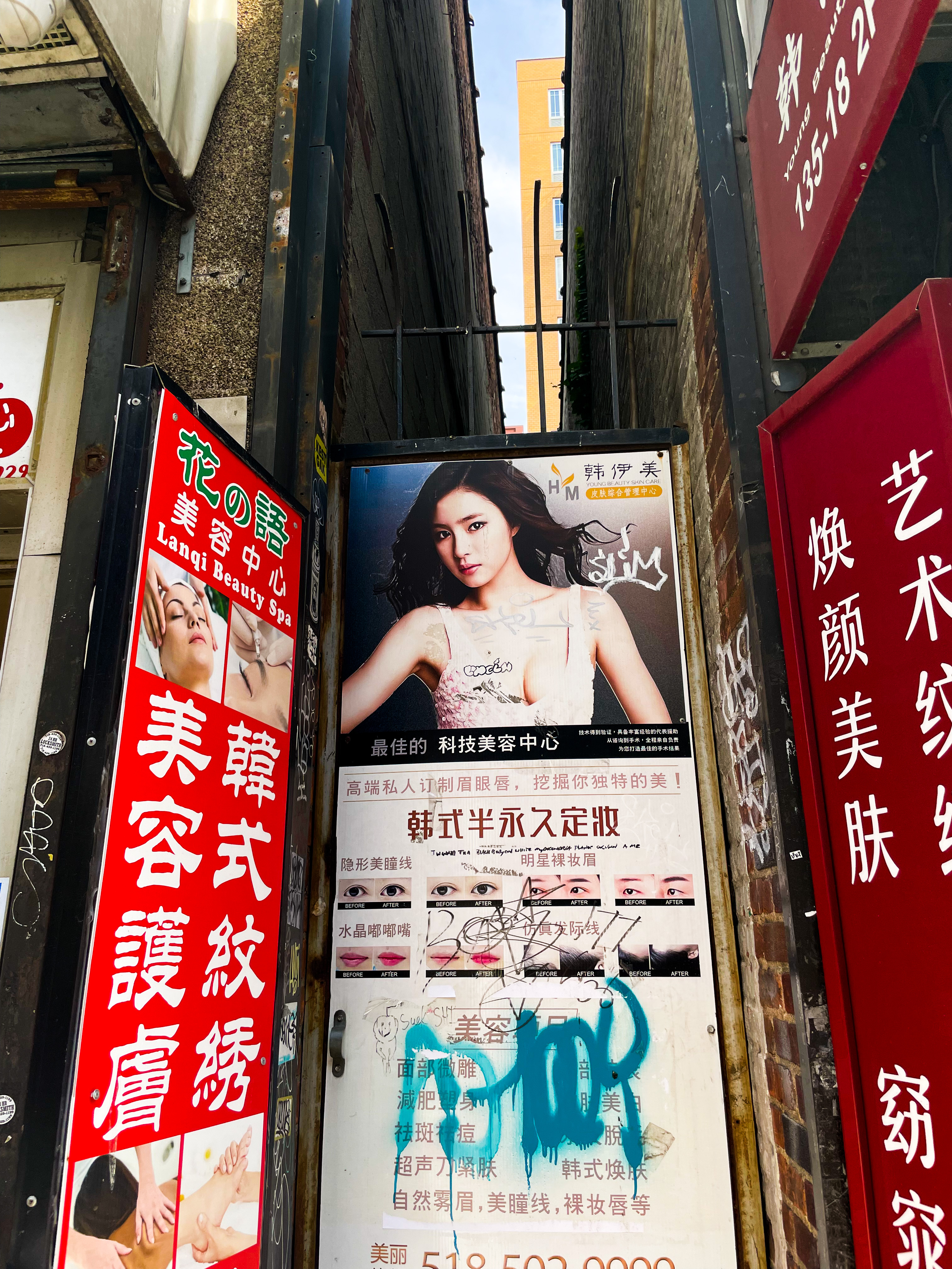 They look like any other small town in China, but have more signs with different fonts and English translations. Compared to other areas in New York, they have greater diversity and concentration of Chinese restaurants, massages, beauty salons and Asian population. Everything in Chinatown has its own distinct personality and character, in contrast to the Chinese bland metropolitan image of the cities. Here I could find a white menu on the wall with red graffiti painted below by street artists, or a Mexican fruit merchant posing to the camera. There is a kind of indescribable sense of incongruity, but also colorful, vivid, and appealing.